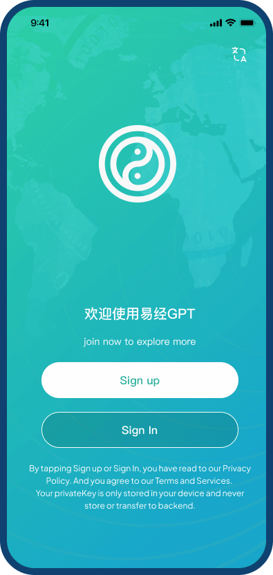 易经GPT App uses blockchain based wallet address as accountID to maintain anonymity. For new sign-ups the app generates wallet address and ask users to save privateKey